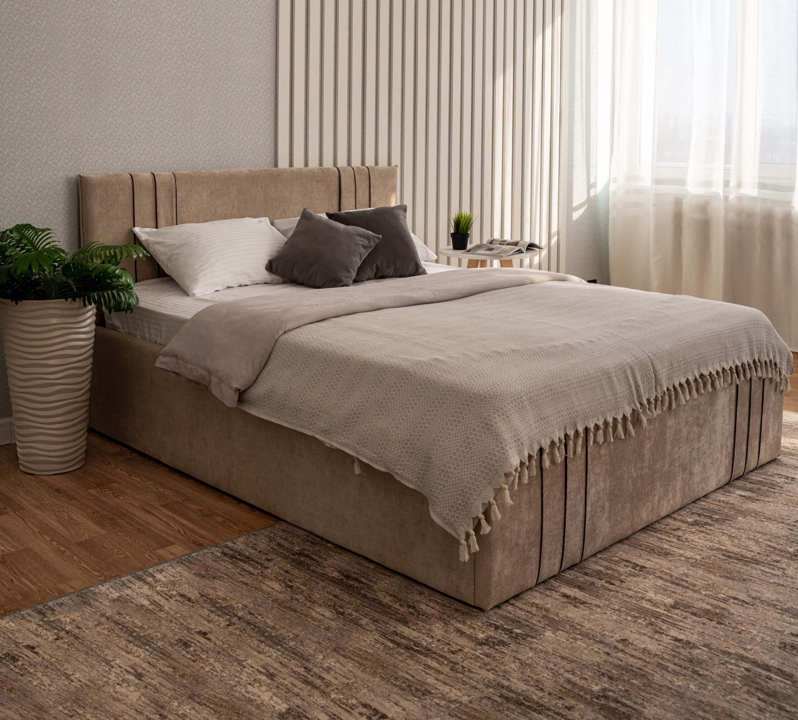 Кровать доступна в трех модных цветах и выполнена из высококачественной рогожки с антивандальными свойствами, что обеспечивает долговечность и надежность. Внутренняя обивка из спандбонда делает мебель устойчива к износу и механическим повреждениям, не впитывает влагу, гарантируя долгий срок службы.